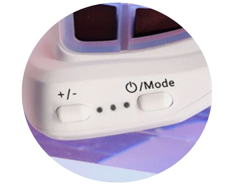 Die Buchse für das USB-Ladekabel befindet sich auf der linken Brillenseite. Beim Aufladen leuchten die LED's an der Unterseite der Brille Rot auf. Sobald die Massagebrille vollständig geladen ist, wechselt die Farbe der LED's auf Grün.