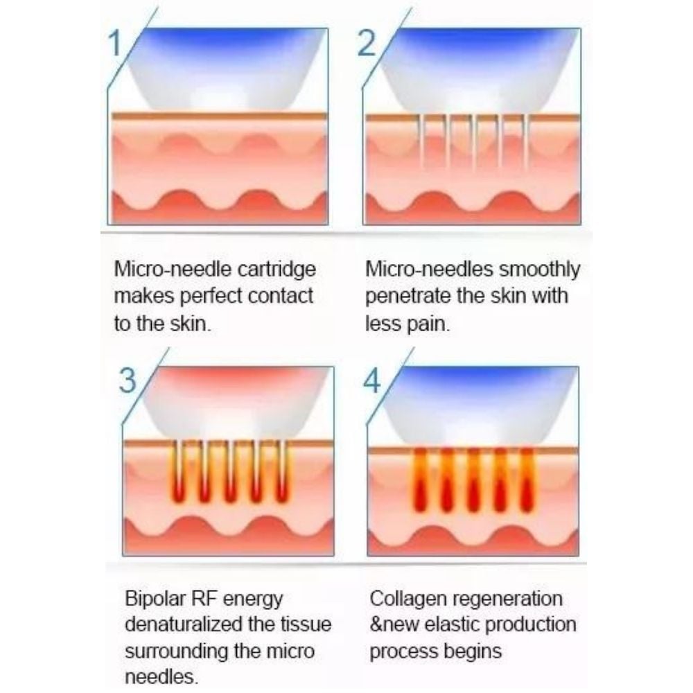 Die Haut mittels Vakuum-Funktion zuerst angesaugt. Danach dringen die Microneedling Nadeln kurz in die Haut ein und werden innert einer Millisekunde wieder herausgezogen. Gleichzeitig wird die Haut mit einem kurzen Radiofrequenzimpuls behandelt. Die Radiofrequenzwellen können direkt in den Zielbereich eindringen, um eine maximale Wirkung zu erzielen.